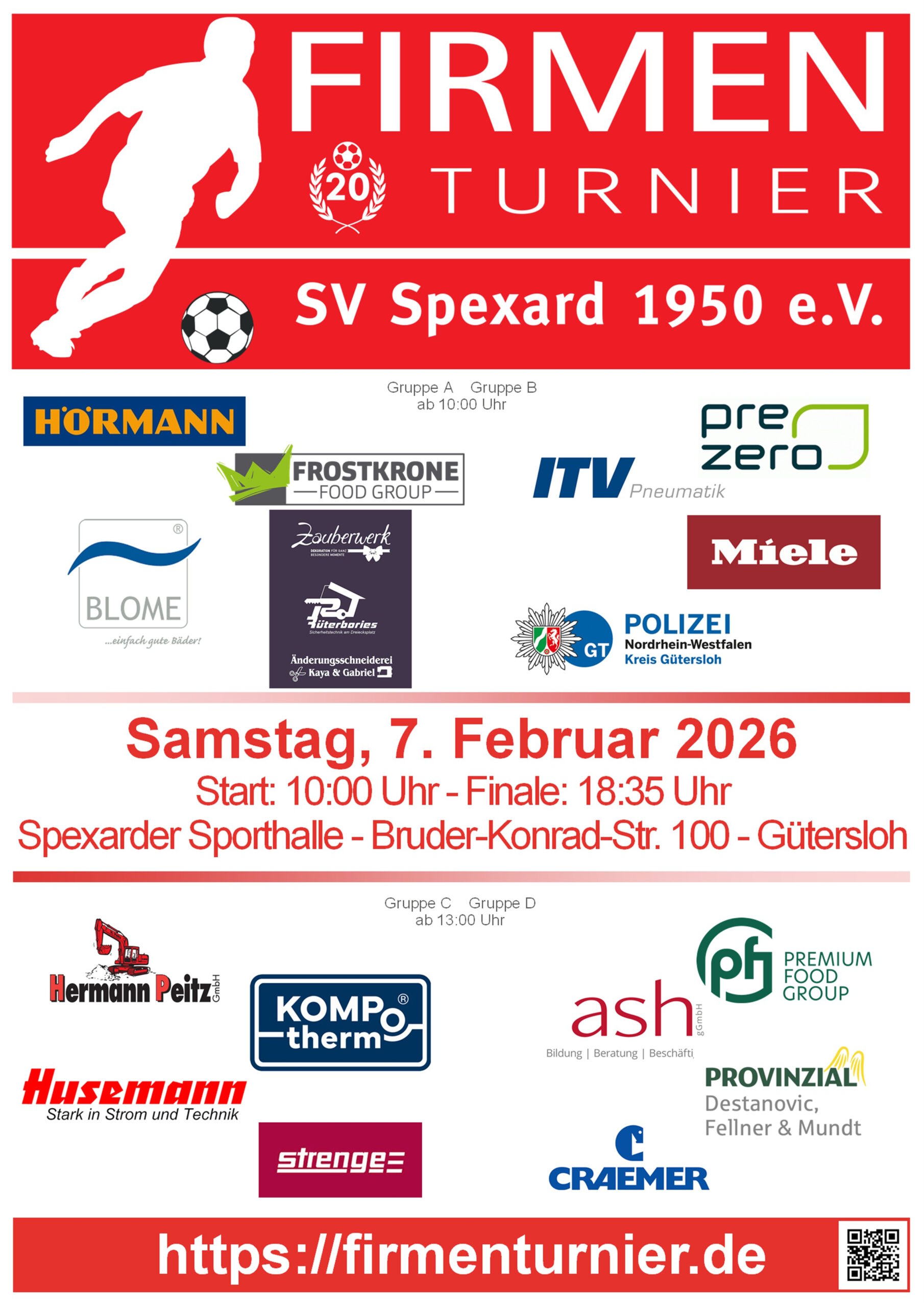 Am 07.02.2026 findet das zwanzigste Firmenturnier in der Spexarder Sporthalle statt. Start ist um 10:00 Uhr mit den Gruppen A und B. Die Gruppen C und D folgen um 13:00 Uhr. Die jeweils beiden Gruppenbesten spielen dann die Viertelfinale aus. Das Endspiel ist gegen 18:35 Uhr geplant.